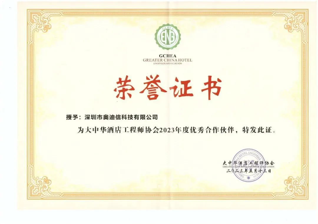 深圳市奥迪信科技有限公司是一家专注于酒店智能客房系统产品的企业,最近荣获大中华酒店工程师协会2023年度优秀合作伙伴证书。这是对我公司在智能化酒店工程建设、产品开发、技术支持等方面的专业能力和综合实力的充分肯定。