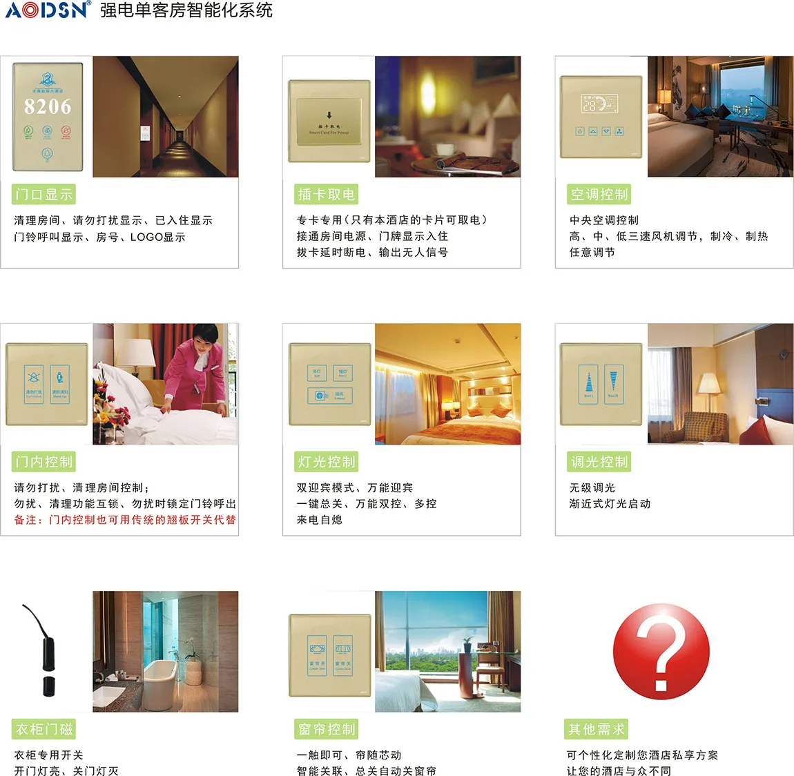 产品简介: 奥迪信酒店客房智能控制系统,是利用现代计算机通讯、控制技术,基于客房内的RCU主机(客房宝盒)构成专用的网络,对酒店客房的中央空调系统、智能灯光系统、安防系统、紧急呼叫系统、门禁系统、服务系统等进行智能化...