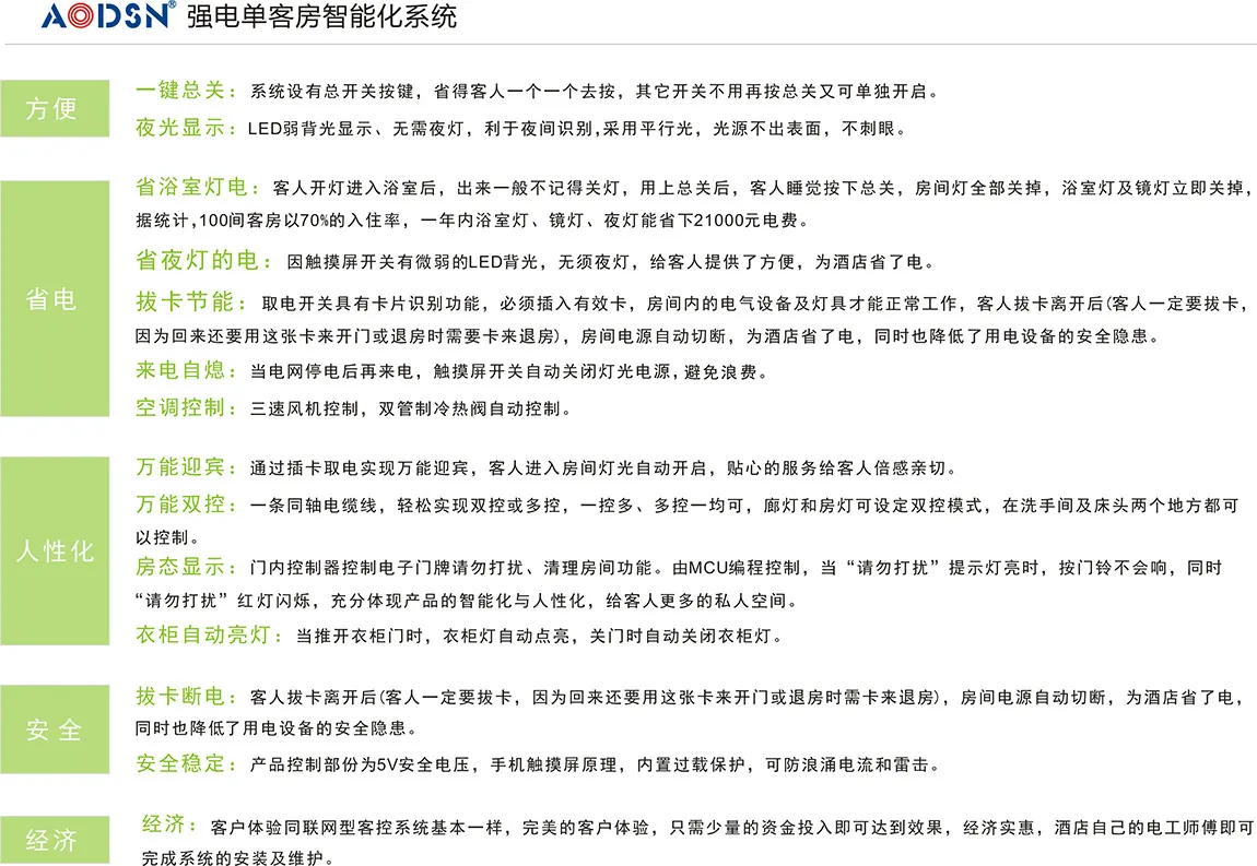 奥迪信酒店客房智能控制系统,是利用现代计算机通讯、控制技术,基于客房内的RCU主机(客房宝盒)构成专用的网络,对酒店客房的中央空调系统、智能灯光系统、安防系统、紧急呼叫系统、门禁系统、服务系统等进行智能化管理与控制,实时监测客房状态、宾客需求、服务状况以及设备情况等,协助酒店对客房设备及内部资源时行实时控制分析的综合控制系统。可以实现节能、提高客人的入住舒适度,提高酒店管理水平、节省人力资源等目的。